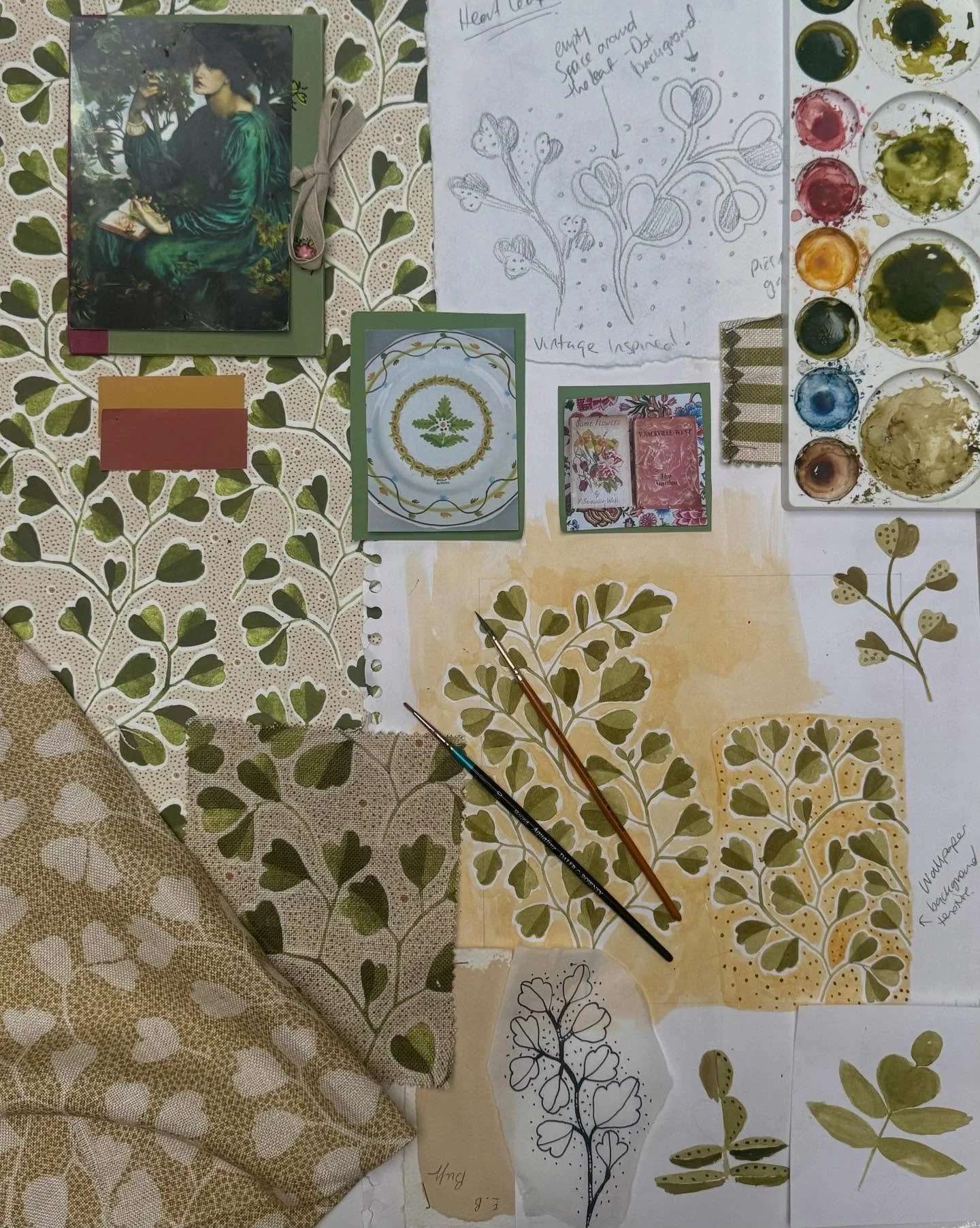 The new collection comprises six fabric designs with coordinating wallpapers, that riff on delicate botanicals, from clover to petals, in a grounding palette of greens, blues and sandy browns.